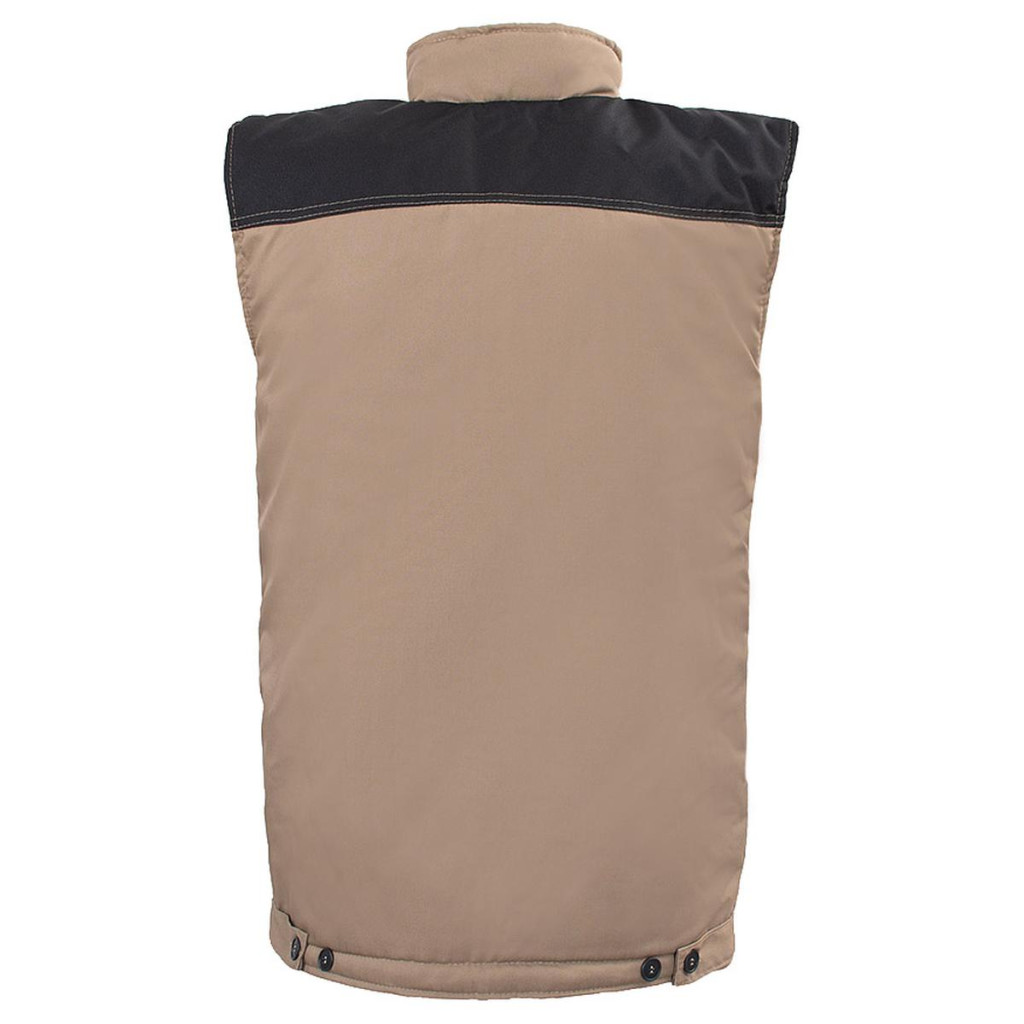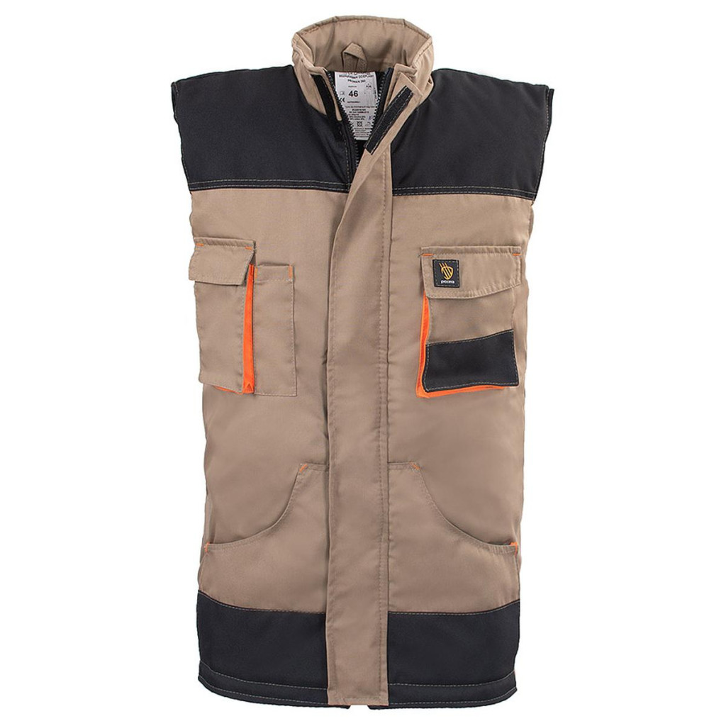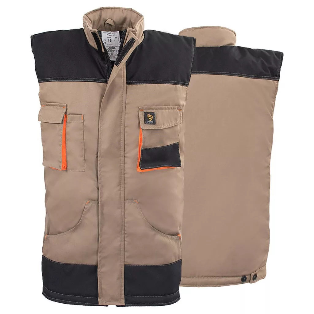 Ujjatlan kabát 65% poliészter / 35% pamut anyagból, 260 g/m súlyú, szigeteléssel. Cipzárral rögzítve, tépőzárral borítva. Két zseb a mellkason, köztük egy zseb egy okostelefonnak és egy kis hosszú zseb, például ceruzának, a másik oldalon egy tépőzáras zseb és két alsó zseb található. Erősítő csavarok, dupla varratok a tartósságért és gombos állítás a deréknál. OXFORD típusú erősítések. Lengyelországban készült. Méretek: 46 – 62. A következő színekben kapható: szürke, terepszínű, kék, szafari, sárga HV és narancssárga HV (jó láthatóság további fényvisszaverő szalagokkal). PROMAN munkaruha összeszerelési lehetőség.
