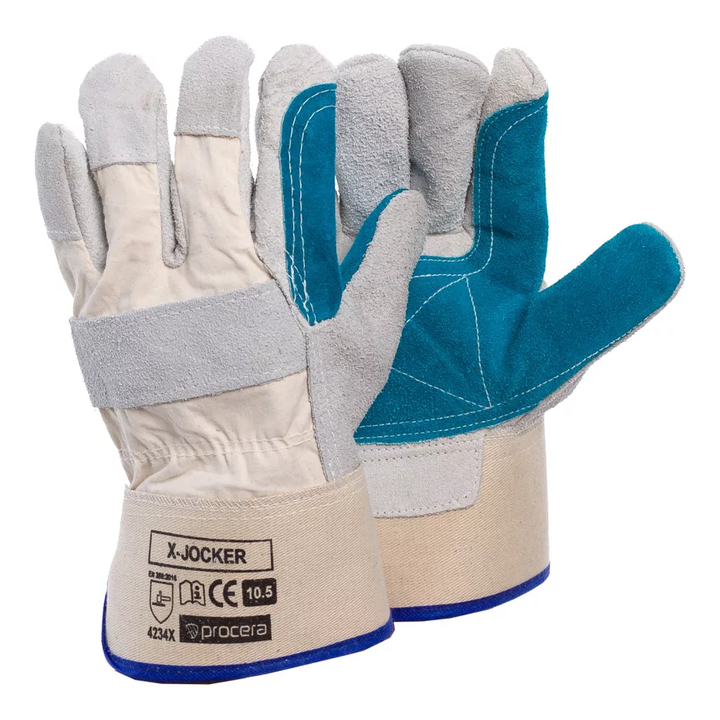Felső részén pamutszövetből készült, ötujjas, egész tenyérnyi kesztyű. A markolatrész kiváló minőségű tehén hasított bőrből készült, natúr színben. A markolaton, a mutatóujjon és a hüvelykujjnál további, kék tehén hasított bőrből készült megerősítés található. A felső részen, a kézközépcsont vonalán és az ujjbegyeken hasított bőr megerősítések is használatosak. A mandzsetta gumírozott és díszítéssel van kidolgozva, amely fölött egy bevarrt szorítószalag található, amely biztosítja a kényelmet és a használat szabadságát. Belül a markolatrészben a kesztyűk puha béléssel vannak befejezve. A kesztyű nagyon jó tapadást biztosít. II. kategória. 10.5-ös méretben kapható. Csomagolás: karton 12/72.