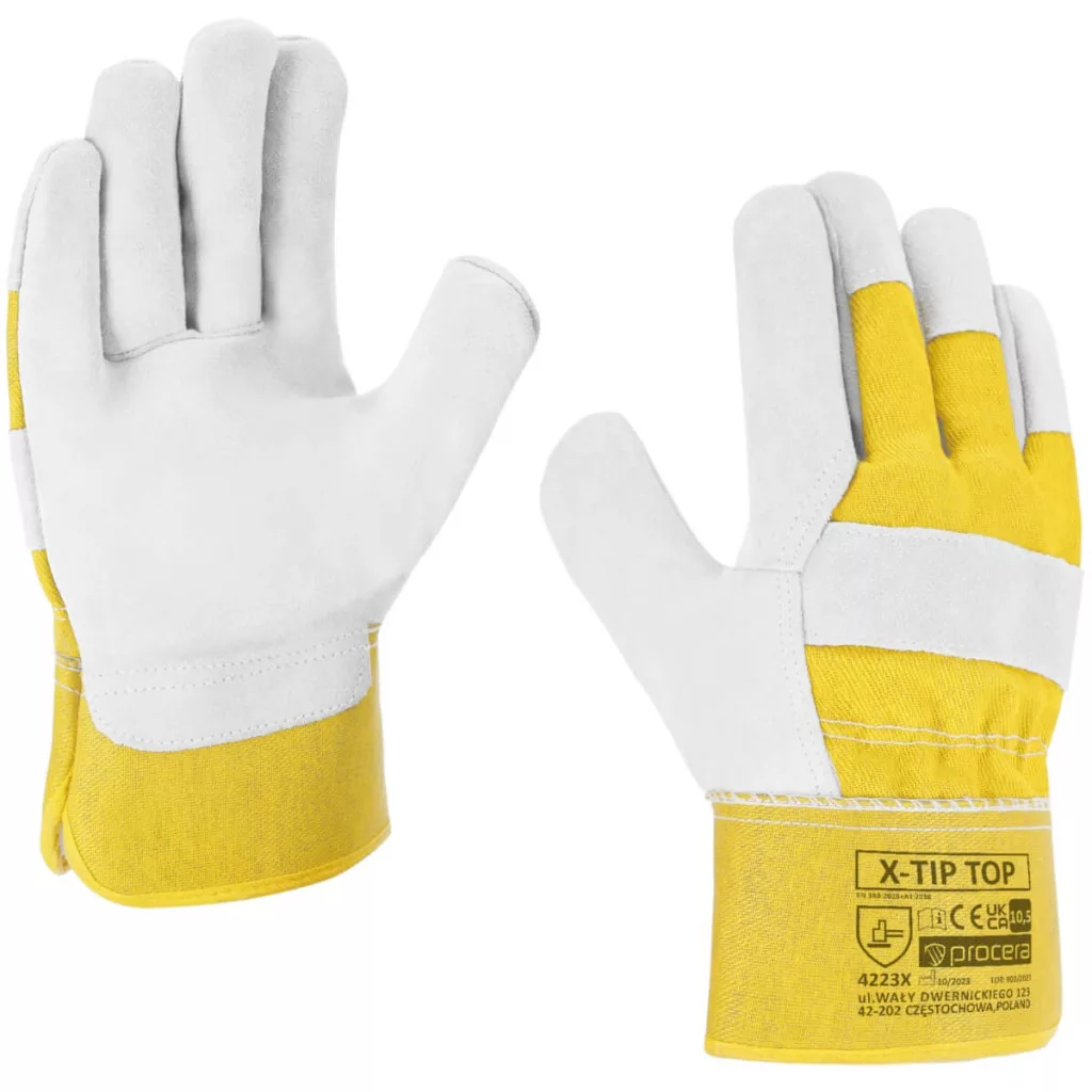 Hasított bőrrel megerősített munkakesztyű, teljes tenyér, sárga farmer szövet. A megfogó rész egy darab bőrből készült - természetes színű hasított marhabőrből. Rugalmas szalag a mandzsetta felett. Bőr megerősítés a kézközépcsontok vonalán és az ujjbegyeken. Gumírozott farmer mandzsetta, belső markolat bélelt. EN 388 Tömeges csomagolás: 72 pár Méret: 10.5