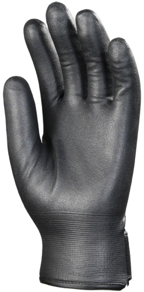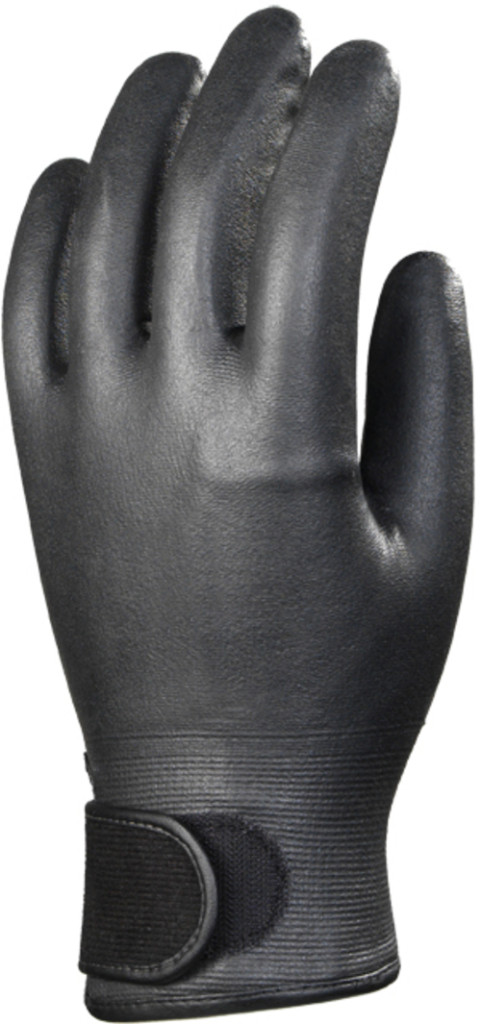 Fekete, varrás nélküli poliamiddal erősített 15-ös kötésű kesztyű teljesen mártva fekete puha nitrillel.Fekete polár bélésselTépőzáras mandzsetta