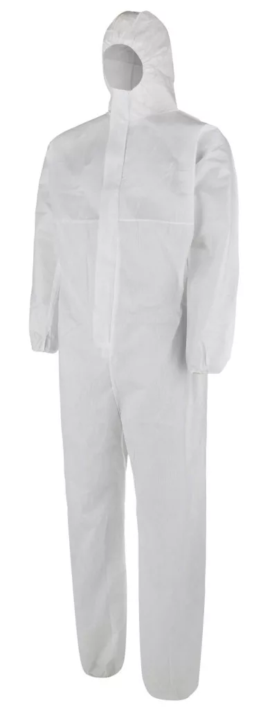 Bocoro egyszerhasználatos overálkapucnis lélegző védőruha nem szőtt textilből - SMSkibővített megerősített lábközi részösszehúzó gumik a kapucnin, hátrészen, ujjak és nadrágszárak végénfehér szin (varratokkal és cipzárral együtt)Méretek: M - 4XLSZABVÁNYOK: EN ISO 13688, EN ISO 13982-1 - TYPE 5, EN 13034 - TYPE 6