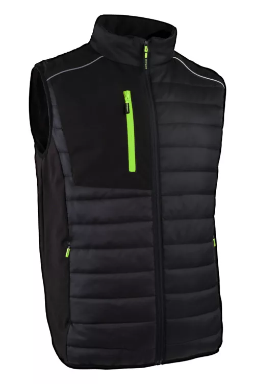 Külső: 100% nejlon mikro-ripstop + bélés: 100% poliészter Sorona technológiával -100 g/m2 + 3 rétegű softshell Polár álló gallérÁllig érő cipzár + állvédő 1 cipzáras softshell mellzseb, 2 függőleges oldalzseb + rejtett cipzárok a varrásban 1 tépőzáras belső zseb Gumírozott aljrész Softshell betétes váll-, mell-, oldalrészek és zsebek Hosszított hátrész Vállakon fényvisszaverő díszcsík