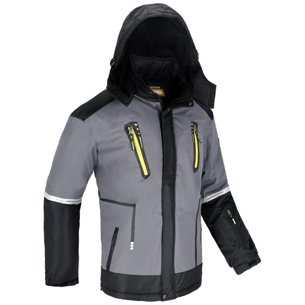 A kabát 100% tartós poliészterből készült, belülről gyapjúval szigetelt, és cipzárral záródik, cipzáras patenttal. Két zárt cipzárral ellátott mellzsebbel, két alsó zsebbel, egy zsebbel az ujján egy proximity kártya számára és egy kis zsebbel a belsejében tépőzárral. A további állítással ellátott bordázott mandzsettával ellátott ujjak növelik a kényelmet, miközben javítják a hőszigetelést. A levehető, gyapjúval bélelt kapucni elasztikus húzózsinórral és dugókkal további védelmet nyújt a hideg és az időjárás ellen. A kabát kerülete a szegélynél állítható. Modern színek és dizájn. Színek: szürke/fekete/sárga. Méretek: S - XXXL. Csomagolás: 1/10 karton.