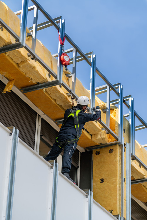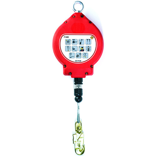 * visszahúzható zuhanásgátló, 10 m hosszú 4,5 mm átmérőjű galvanizált acélsodronnyal, karabinerrel