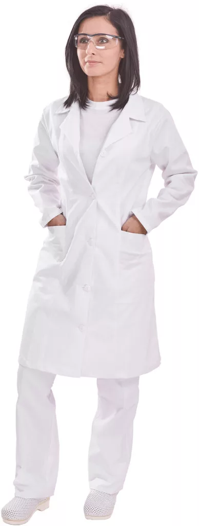 * fehér színű, 230 g/m2 vastag, kiválóan szellőző, testbarát 100% pamut alapanyag, mely 90°C-on is mosható * Köpeny: egyenes szabású, galléros, három zsebbel, gombos kialakítású