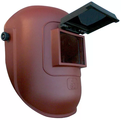 * felhajtható szűrőüveg tartó * állítható boltozati magasságú és bőségű polietilén fejkosár biztonsági csattal * súlya: 345 g * pajzs mérete: 220 x 350 x 200 mm , látómező mérete: 90 x 110 mm