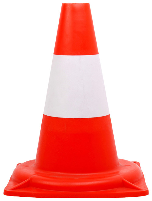 * stabil talpon álló közúti bója * széles, vízszintes fényvisszaverő  csíkok, piros-ezüst szín *  54 cm magas, könnyű (0,85 kg) polietilén anyag