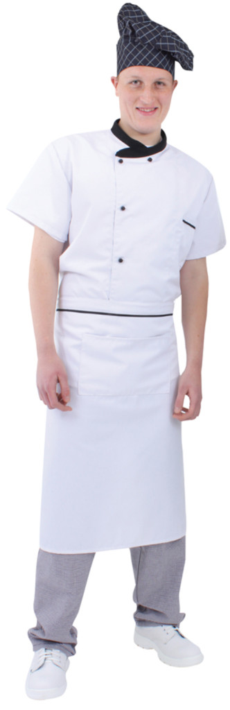 245 g/m2 vastag, lánckötésű, 65% kopásálló poliészter, 35% pamut alapanyag,rögzítés derékszalagokkal,72 x 85 cm-es méret,nagy és széles osztott zsebek, kontraszt díszcsíkkal