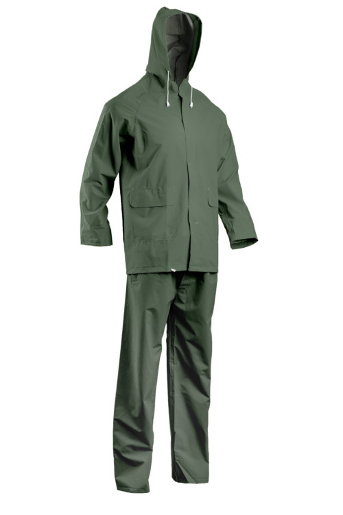 * poliészter/pamut alapra kétszer mártott PVC* 0,32 mm vastag, varrott és hegesztett, vízálló* cipzáras és patentos záródás* KABÁT: 85 cm hosszú, fedett cipzár, húzózsinóros kapucni, szellőzőnyílás a háton, 2 fedett oldalzseb, állítható aljrész* NADRÁG: gumírozott derék, patenttal szűkíthető lábszár, sliccelt zsebnyílás, patenttal záródó slicc