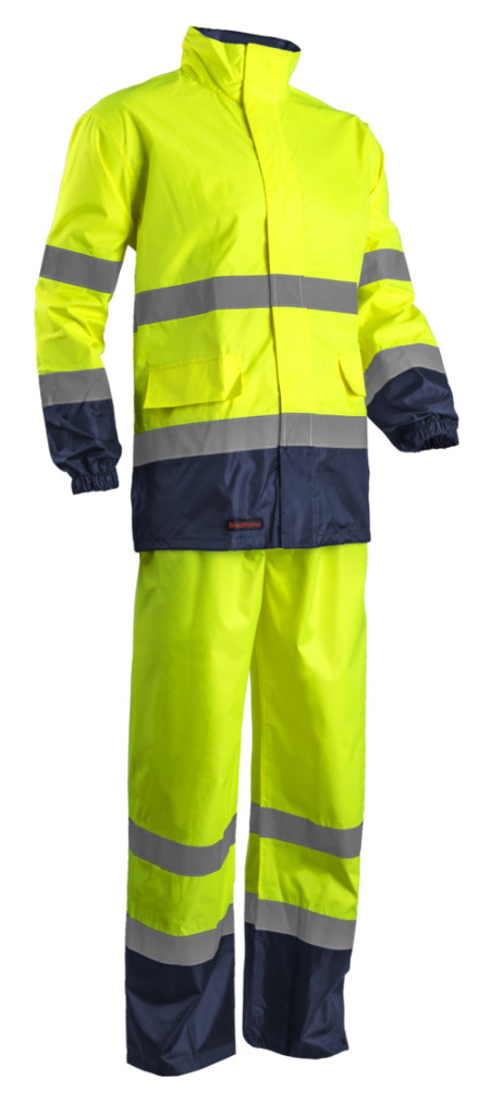 * 180 g/m2 lélegző (páraáteresztő képesség: 2000 mvp) poliuretánnal bevont, vízhatlan (vízállóság: 2000 mm) Oxford poliészter* 5 cm széles fényvisszaverő csíkok, hegesztett biztonsági varratokkabát: végig cipzáras álló gallér, rejtett kapucni, két oldalzseb, állítható alj* nadrág: gumírozott derék, szűkíthető, patentos bokarész * 2 féle színősszeállításban: sárga/fekete, narancs/fekete