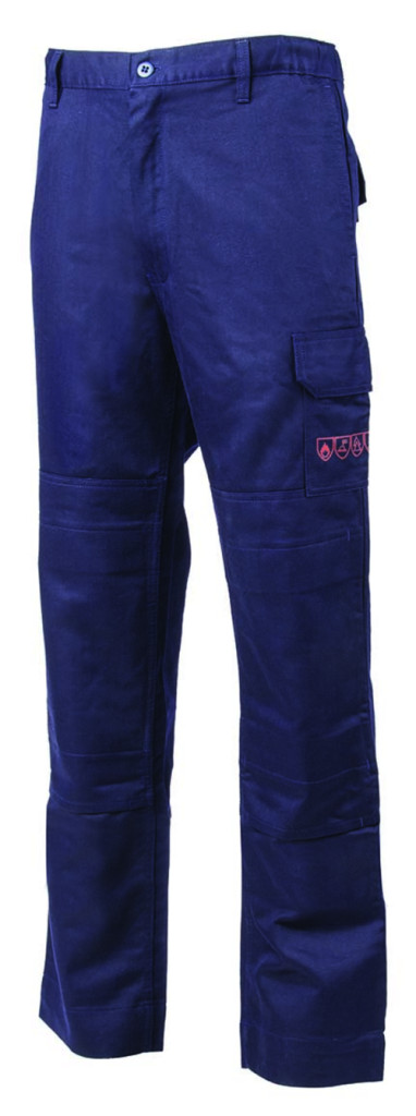 * 350 g/m2 vastag, 98% pamut + 2% antisztatikus alapanyagú sötétkék, láng-, és íválló, antisztatikus hegesztő védőnadrág* cipzáras záródás, gumis derékrész övbújtatókkal, alul nyitott térdvédő zsebek* bokánál 5 cm-es lehajtható szegés, szabványok piktogramjai a combzseb ráhajtásán* 2 fedett farzseb, 2 oldalzseb, 1 fedett combzseb patenttal, 1 fedett szerszámzseb