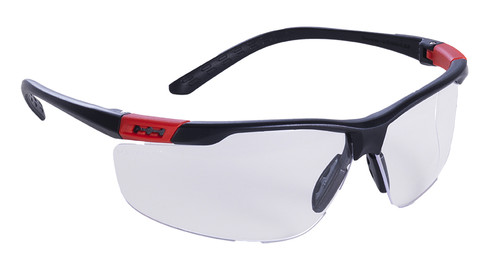 Ívelt karcmentes (K) víztiszta polikarbonát lencse UV védelemmel Önbeállító, fekete, kétkomponensű polikarbonát szár, állítható csúszásbiztos orrnyereg és egybeépített oldalvédő