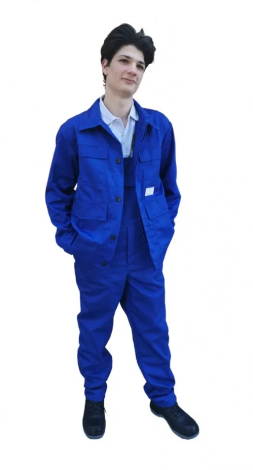* királykék mellesötöny, 350 g/m2-es, lángmentesített, 99% pamut alapanyag + 1% beleszőtt, minősített antisztatikus szállal ** biztonsági varratok kettős lánc-, plusz 3 fonalas szegőöltéssel* kabát (5SAKA220): meghosszabbított dzseki fazon, több helyen reteszelt rejtett gombolás, négy rávarrt, tépőzáras zsebfedővel rendelkező, könnyebben használható biztonsági zseb, állítható mandzsetta* mellesnadrág (5SAMN220): állítható, gumibetétes vállpánt, magasított oldal, gumírozott hátrész, két függőleges nyílású biztonsági foltzseb és a mellrészen egy tépőzáras zsebfedővel rendelkező biztonsági zseb
