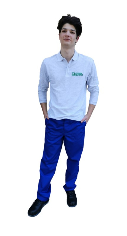 * királykék 350 g/m2-es, lángmentesített, 99% pamut alapanyag + 1% beleszőtt, minősített antisztatikus szállal * biztonsági varratok kettős lánc-, plusz 3 fonalas szegőöltéssel* mindenhol fedett hőálló teflon gombok, a zsebeken tépőzáras zsebfedők, vagy a zsebek nyílása függőleges irányú, így megakadályozzák a szikrák és forró fémcseppek bejutását* enyhén szűkülő szárú, rejtett gombolás, 6 erősített övtartó, két függőleges nyílású biztonsági foltzseb