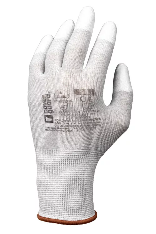 Szénszálas, rugalmas, kötött poliészter precíziós védőkesztyű, fehér PU-val mártott ujjakkal és kötött mandzsettávalKiváló fogásbiztosságának köszönhetően tökéletesen alkalmas apró mikro-elektronikai alkatrészek kezeléséhez Megakadályozza az elektrosztatikus kisülést és tűz- és robbanásveszélyes környezetben is használható