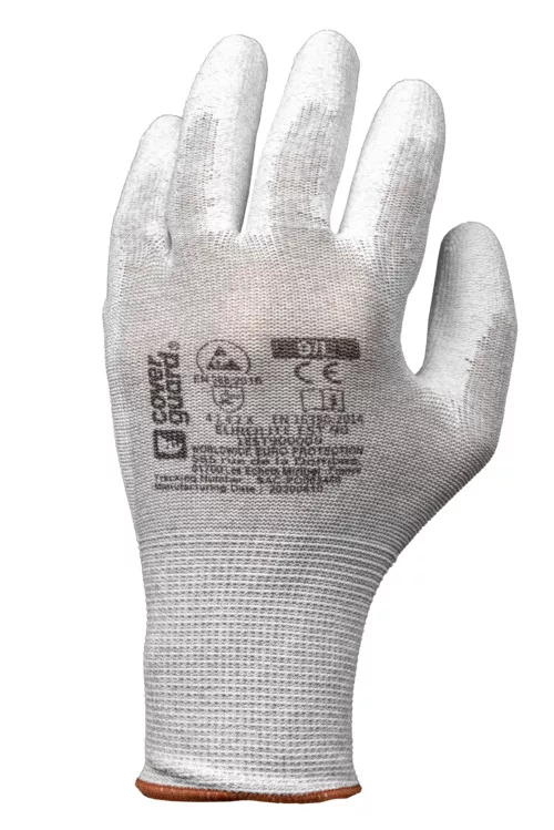 Szénszálas, rugalmas, kötött poliészter precíziós védőkesztyű, PU-val mártott tenyérrel és kötött mandzsettávalKiváló fogásbiztosságának köszönhetően tökéletesen alkalmas apró mikro-elektronikai alkatrészek kezeléséhez Megakadályozza az elektrosztatikus kisülést és tűz- és robbanásveszélyes környezetben is használható