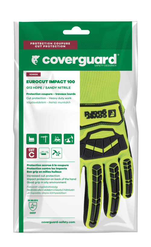 * maximális szakítás- és kopásállóságú, C színtű TDM vágásbiztosságú, 13-as kötésű, multiszálas (HDPE, poliészter és Spandex alapanyagú) sárga védőkesztyű, beütés elleni védelemmel