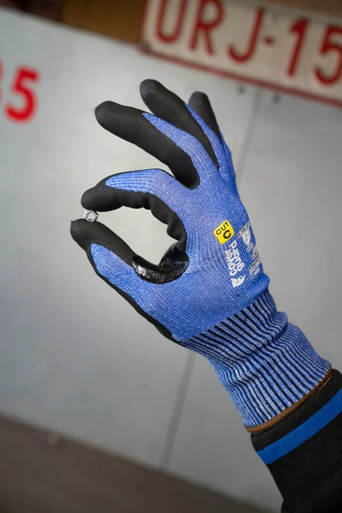 * maximális szakítás- és kopásállóságú, C szinten TDM vágásbiztosságú, 13-as kötésű, multiszálas (HDPE, poliészter és spandex alapanyagú) kék fogásbiztos védőkesztyű