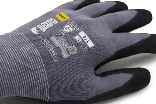 EUROLITE MAX25 kesztyű, 15-ös kötésű szürke poliamid védőkesztyű, tenyérén fekete sandy nitrillel mártva. Kötött, elasztikus mandzsetta,OEKO-TEX® STANDARD 100 minősítés, CQ 1301/1, IFTH vagy SH020 131830, TESTEX
