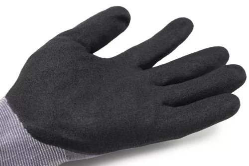 EUROLITE MAX25 kesztyű, 15-ös kötésű szürke poliamid védőkesztyű, tenyérén fekete sandy nitrillel mártva.