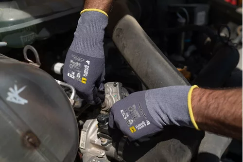 EUROLITE MAX25 kesztyű, 15-ös kötésű szürke poliamid védőkesztyű, tenyérén fekete sandy nitrillel mártva.
