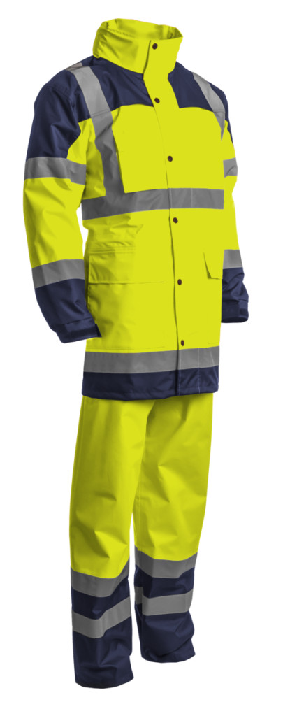 * poliuretánnal bevont, vízhatlan fluoreszcens Oxford 300D poliészter , 5 cm széles fényvisszaverő csíkok, hegesztett vízálló, biztonsági varratok* kabát: végig cipzáras álló gallér, patentos fedéssel* rejtett, speciális kialakítású viharkapucni, két oldalzseb, állítható derék, két függőleges és két vízszintes fényvisszaverő csík* nadrág: gumírozott derék, patenttal szűkíthető bokarész, két oldalzsebnyílás és slicc