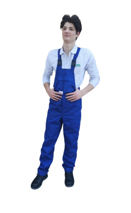 * királykék, 350 g/m2-es, lángmentesített, 100% pamut alapanyagú, minősített hő és láng ellen védő szövet* biztonsági varratok kettős lánc-, plusz 3 fonalas szegőöltéssel* mindenhol fedett hőálló teflon gombok, a zsebeken tépőzáras zsebfedők, vagy a zsebek nyílása függőleges irányú, így megakadályozzák a szikrák és forró fémcseppek bejutását* állítható, gumibetétes vállpánt, magasított oldal, gumírozott hátrész, két függőleges nyílású biztonsági foltzseb és a mellrészen egy tépőzáras zsebfedővel rendelkező biztonsági zseb
