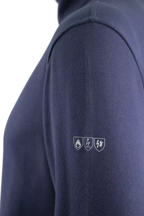 Dzsörzé anyag: 60% modakril / 39% pamut / 1% antisztatikus szál 300 g/m2 - sötétkék * álló gallér * lángálló FR cipzár * 2 zseb * pulóver típusú dzseki EN 1149-5 EN 11612 IEC 61482-2