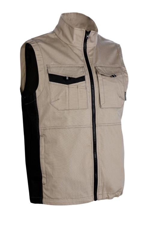 * 240 g/m2 vastag, 35% pamut + 65% poliészter kevertszálas ripstop (továbbszakadás biztos) alapanyag,homok színben,kopásálló Oxford PES betétekkel az erősebben igénybe vett területeknél: oldalrész, zsebek* egyenes szabású, modern formai kialakítású bikolor mellény, szerelők számára kifejlesztve* állig érő húzózár, magas gallérral, hálós béléssel,elasztikus zsinórral állítható derékrésszel* egy cipzáras felső zseb,bebújós függőleges nyílású oldalzsebegy tépőzáras fedett felső zseb + több rekesz,két tépőzáras fedett oldalzseb,bebújós függőleges nyílású oldalzseb