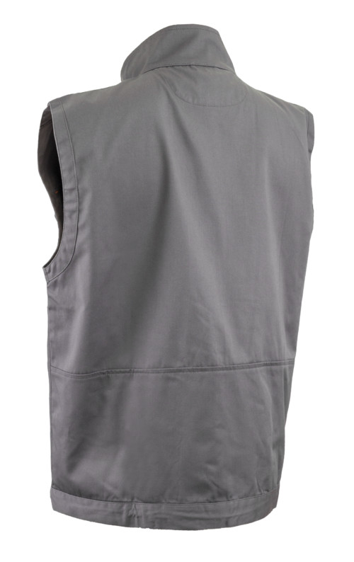 * 245 g/m2 vastag, kopásálló, sávolykötésű anyag, 60% pamut, 40% poliészter* szürke-narancs színű mellény,egyenes szabású állig érő húzózárral, állítható aljrésszel * a betéttel azonos színű varrással, magas gallérral, hosszított hátrésszel* két rávarrt oldalzseb, egy fedett telefonzseb, egy cipzáros függőleges felső zseb, egy tolltartós felső zseb, egy rávarrt fedett felső zseb, egy vízszintes cipzáros zseb bal oldalon, egy kitűzőt tartó gyűrű