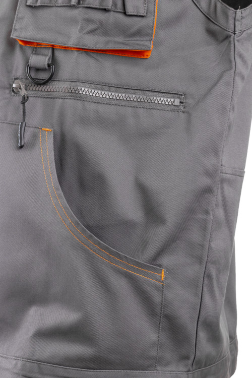 • egyenes szabású húzózárral, állítható aljrésszel • állig érő húzózár, magas gallér • a betéttel azonos színű varrás • hosszított hátrész • két rávarrt oldalzseb • egy fedett telefonzseb • egy cipzáros függőleges felső zseb • egy tolltartós felső zseb • egy rávarrt fedett felsőzseb • egy vízszintes cipzáros zseb bal oldalon • egy kitűzőt tartó gyűrű • 245 g/m2 vastag, kopásálló, lánckötésű anyag, 60% pamut, 40% poliészter • egyenes fazonú, kényelmes ruhák nagy szakítószilárdságú, testbarát anyagból • praktikus zsebek, kulcstartók, névjegytartó és mobil kiegészítők (térdeplőbetét) • esztétikus zsebfedők, bőségráncok, karöltők és cipzárak • SZÍN: szürke, narancs díszítéssel • MÉRET: S-6XL