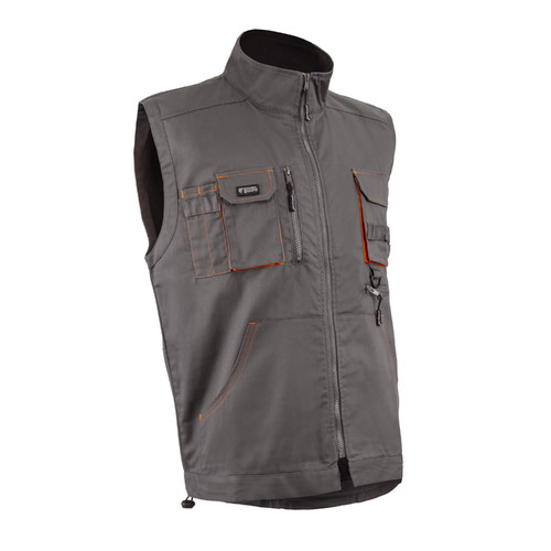 * 245 g/m2 vastag, kopásálló, sávolykötésű anyag, 60% pamut, 40% poliészter* szürke-narancs színű mellény,egyenes szabású állig érő húzózárral, állítható aljrésszel * a betéttel azonos színű varrással, magas gallérral, hosszított hátrésszel* két rávarrt oldalzseb, egy fedett telefonzseb, egy cipzáros függőleges felső zseb, egy tolltartós felső zseb, egy rávarrt fedett felső zseb, egy vízszintes cipzáros zseb bal oldalon, egy kitűzőt tartó gyűrű