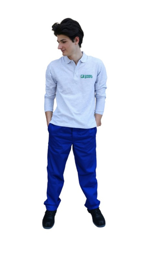 * királykék 245 g/m2 kopásálló, sávoly kötésű, 65% poliészter, 35% pamut alapanyag* folyadéklepergető védőruházat, korlátozott védelmet nyújt kisnyomású vagy fröccsenő, folyékony vegyszerek ellen (pl. kénsav, lúg, o-Xilol és butanol) – 6. típusú és PB (6) típusú védőeszköz* biztonsági kettős lánc-, plusz háromfonalas szegőöltés* enyhén szűkülő szárú, rejtett gombolás, 6 erősített övtartó, két függőleges nyílású biztonsági foltzseb