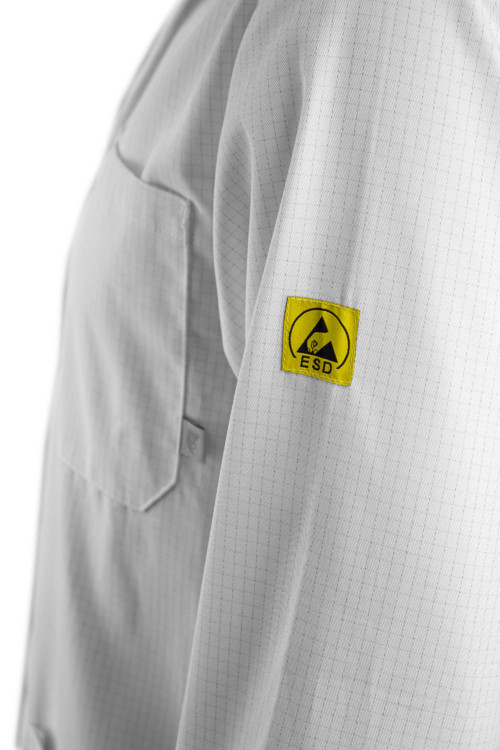Twill (sávoly szövés): 65% poliészter / 33% pamut / 2% antisztatikus szál - 195 g/m2 * szabógallér * rejtett fém patentok * 3 zseb * hátul sliccelt ESD EN 1149-5 XS-es mérettől