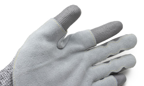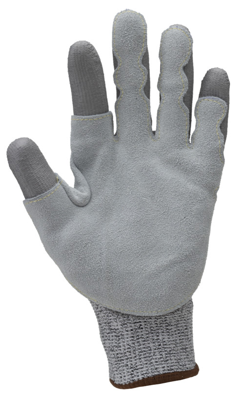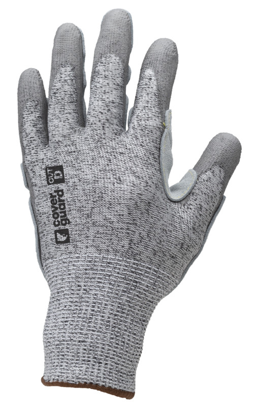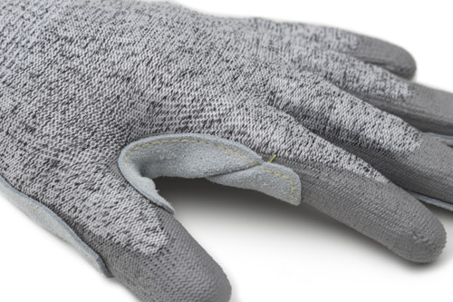 13-as kötésű, HDPE / poliészter kesztyű, tenyerén és az ujjakon szürke PU bevonat és bőr megerősítés, a hüvelykujj és a mutatóujj kivételével; Para-aramid varrás és kötött mandzsetta.