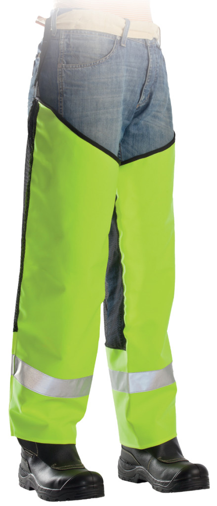 Fluo sárga színű, fényvisszaverő csíkok. Derékszíjra tehető teljes comb- és lábszárvédő. Poliamiddal vízhatlanított, könnyű poliészter. Hátul a combtól hálós, tökéletesen szellőző anyag.