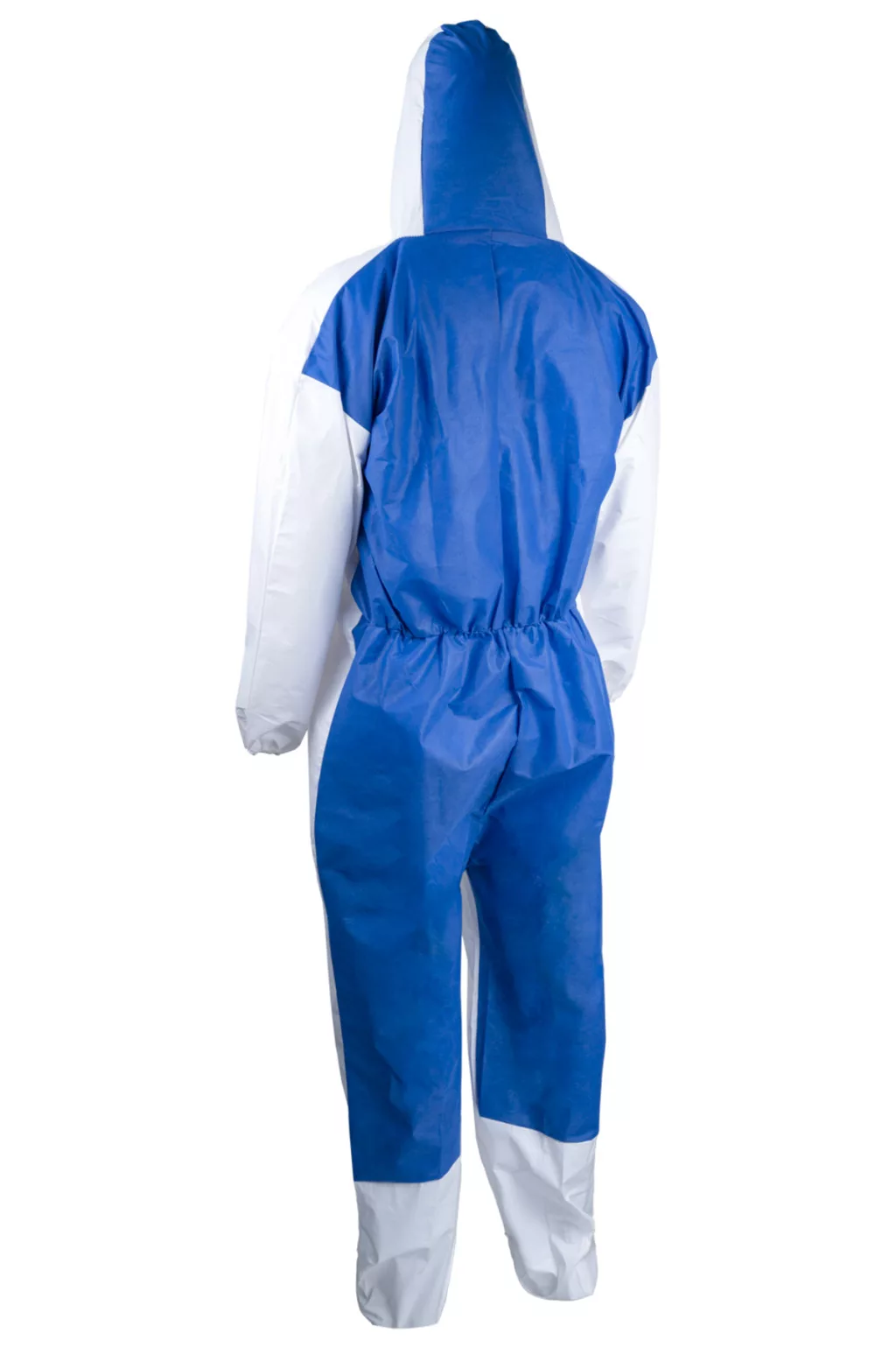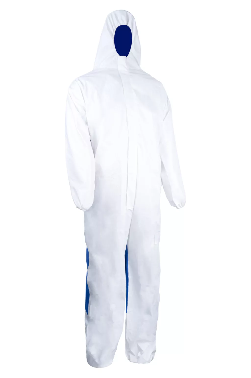 III. kategóriájú, két különböző anyagból készült védőruhaElülső részén fehér laminált mikroporózus fóliával (65 g/m²), hátsó részén kék SMS-szel (55 g/m²).Védelem korlátozott mennyiségű vegyi anyagok (6. típus), szilárd részecskék (5. típus) és radioaktív részecskék (EN 1073-2 1. osztály) ellen.Antisztatikus védőruházat EN1149-5Két anyagból készült, elasztikus, 3 részes kapucniKétutas központi cipzár ragasztós cipzárfedővel.Gumírozott derékrész, mandzsetta és bokarész.