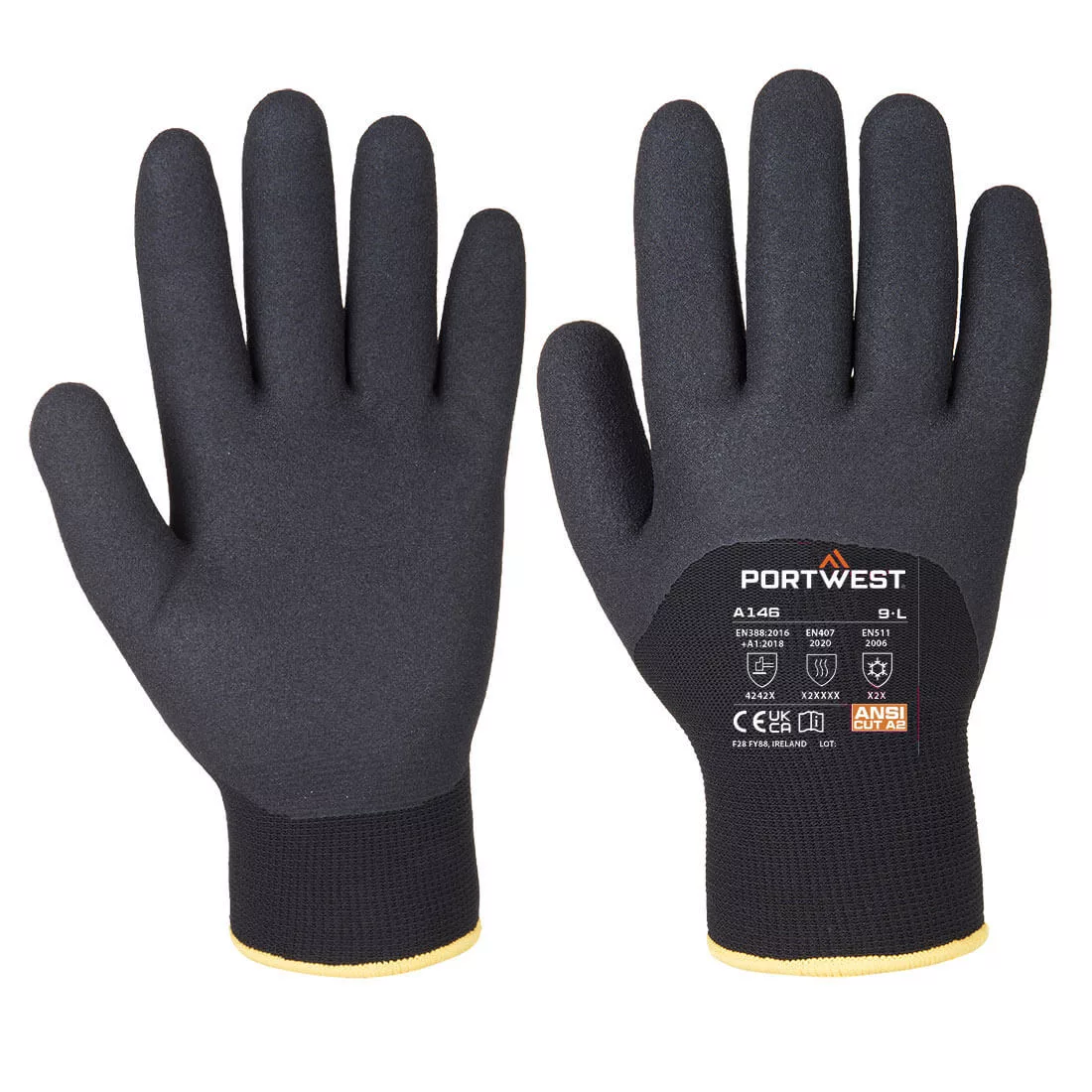 A dupla bélés csapdába ejti a hőt. A 3/4 nitril homokos mártás nagyobb védelmet nyújt az ujjaknak és jobb védelmet nyújt a folyadékok ellen. Nyitott kézhát a szellőzésért. 250°C kontakt hővédelem. Számos iparágban tökéletes választás.