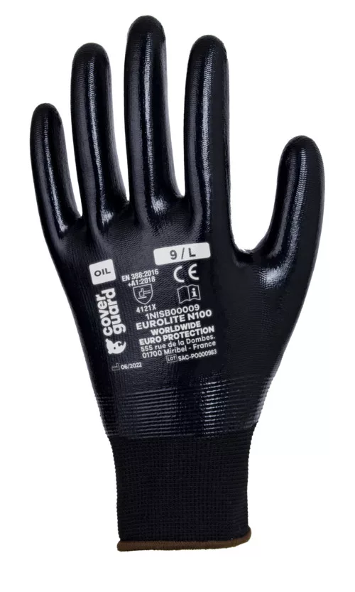 EUROLITE N100 15-ös kötésű, fekete, varrás nélküli poliészter védőkesztyű,Fekete sima nitrillel végig mártva,Kötött mandzsetta