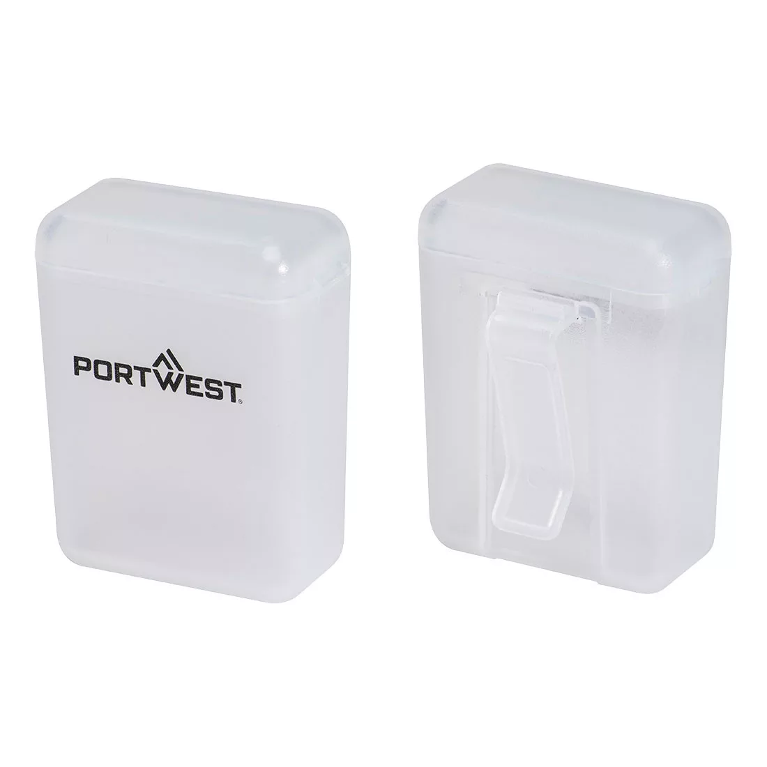 Praktikus műanyag tároló 1 pár füldugó számára, átlátszó műanyagból készült, praktikus övcsipesszel ellátott.