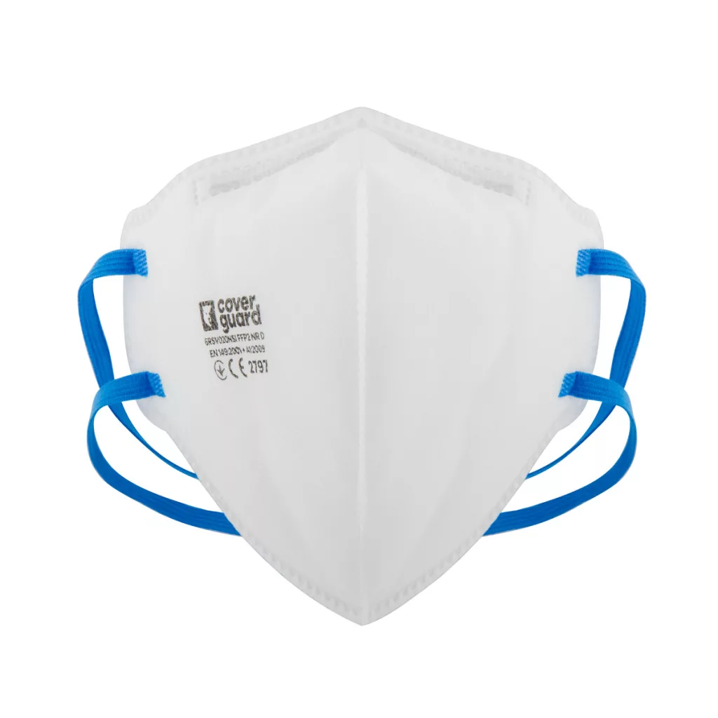 Egyszer használatos, függőlegesen összehajtható FFP2 pormaszk elektrosztatikus meltblown eljárással előállított alapanyagból, elasztikus szövet fejpánttal, állítható orrcsipesszel, mikrohabosított betéttel.