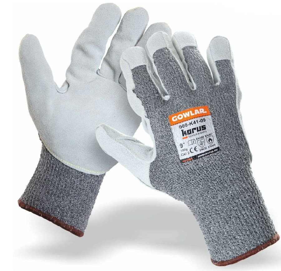 Kombinált kesztyű, speciális kötött szálakból és kevlárból, tenyér hasított marhabőr, ellenáll a vágásoknak és a kopásoknak.