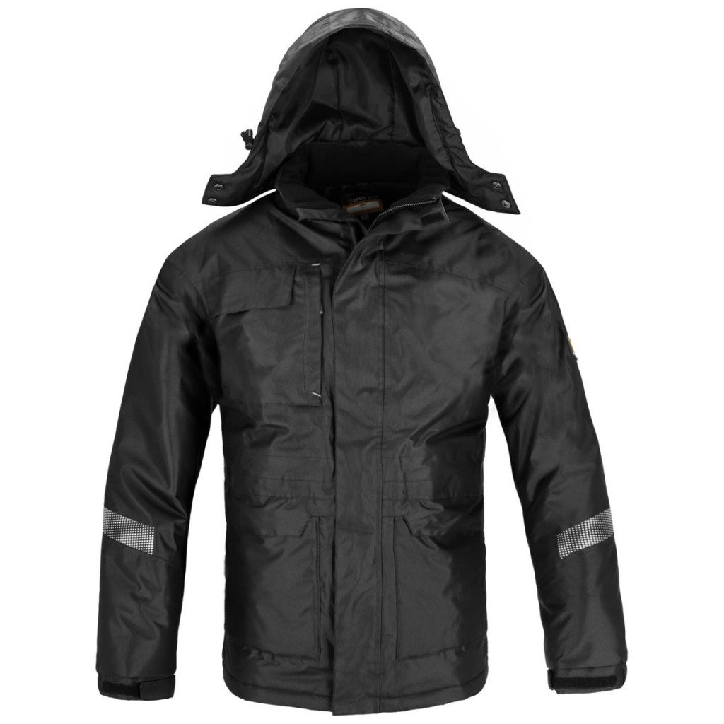 Szigetelt kabát poliészter béléssel és 100% impregnált poliészterből készült külső réteggel. Cipzáras záródás tépőzárral. Egy tépőzáras felső zsebbel, két alsó zsebbel tépőzáras patentokkal és egy cipzáras zsebbel a belső oldalon. A ragasztott varratok növelik az időjárásállóságot. A magas gallér stigma véd a szél ellen, és belül puha gyapjúval bélelt. A bordázott ujjak kiegészítő rögzítésekkel növelik a kényelmet, miközben javítják a hőszigetelést. A kabát levehető kapucnival rendelkezik, zsinórral zárható. A kabát alja állítható. Méretek: S-XXL. Csomagolás: 1/10 karton.