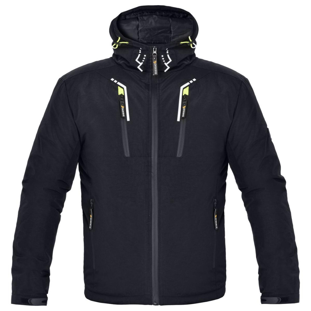 Szigetelt kabát 100% tartós poliészterből, cipzárral. Két mellzsebbel és két cipzáras alsó zsebbel, valamint egy kis belső zsebbel rendelkezik. Tépőzárral állítható ujjak. Szigetelt kapucni húzózsinórral zárható. Méretek: S - XXL. Csomagolás: 1/10 karton.