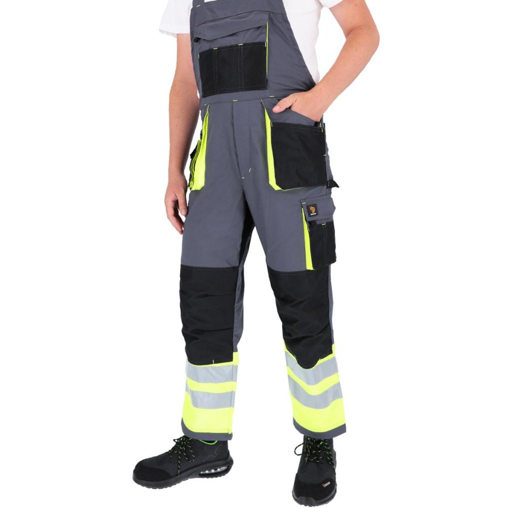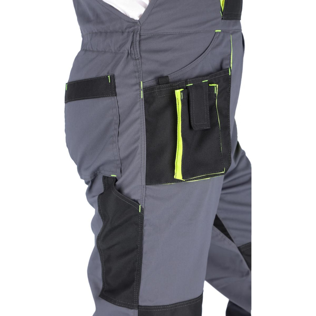 PROMAN STRETCH 250 BIB PANTS Szakadás- és kopásálló főszövetből készült nadrág, összetétele 64% poliészter, 33% pamut, 3% elasztán, 250g/m2 tömegű. Elasztikus anyagból készült kiegészítő betét a lépésbetétben, ami növeli a mozgás szabadságát és a használat kényelmét. Sok funkcionális zseb, köztük egy zseb további külső rekeszekkel, amelyek tépőzárral rögzíthetők a kabáton, dupla első zsebek, hátsó zsebek, egy csomagtartó zseb és egy vonalzózseb. A zsebeken és a térdeken kopásgátló anyaggal ellátott megerősítések, térdvédők használatának lehetőségével. További derékkörfogat állítás. Kiváló minőségű elasztikus nadrágtartók és csatok.