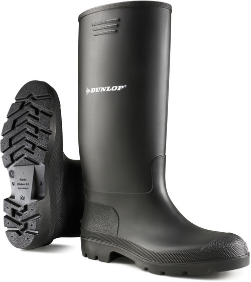 DUNLOP PRICEMASTOR 380PP FEKETE SAV- ÉS LÚGÁLLÓ CSIZMA: * fekete színű, tiszta PVC munkacsizma általános ipari és mezőgazdasági felhasználásra * ellenáll savaknak, lúgoknak, fertőtlenítőszereknek * alaktartó formai kialakítás, vastag, fröccsöntött, csúszásbiztos talp * -20°C-ig használható, csizmabéléssel téliesíthető * széles, kényelmes szár-, lábfej- és orr-rész, könnyen felhúzható *