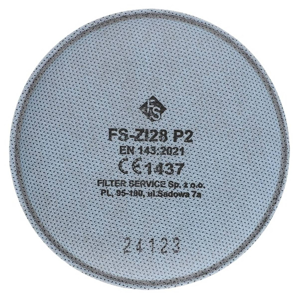 Alkalmazás: A 3M 2128 típusú termék helyettesítésére szolgál. A 3M 6000 és 7500 sorozatú félálarcokkal kombinálva a légzőrendszer védelmére szolgál: szilárd részecskéket vagy vízbázisú aeroszolokat (por, füst), illetve folyékony fázisú diszperz aeroszolokat (ködök) tartalmazó levegő ellen, amennyiben az aeroszol diszperz fázisának koncentrációja nem haladja meg a 12 × NDS-t. Ezen kívül az FS ZI28 P2 szűrők a beépített adszorbens (aktív szén) réteg révén védelmet nyújtanak a megengedett határérték (NDS) alatti koncentrációjú szerves gőzök ellen is. További előnyök: Bagnetzáras rögzítés a félálarc testhez. A 3M 6000 sorozatú szűrőbetétekkel kombinálható a 3M-502 csatlakozó használatával. Legalább 94% szűrési hatékonyság. Könnyű, kényelmes viseletet biztosít. Összetétel – a szűrő felépítése: Tűzött poliészter szálas anyag Melt blown típusú polipropilén szűrő Aktív szenes szálas réteg Külső védőszövet További elemek: Bagnetzáras csatlakozó Kategória: Porszűrők Osztály: P2 NDS: 12 × NDS Szabvány: EN 143:2021 Tanúsítvány: CIOP PIB által kiadott, EU/918/2023/1437 (1. kiadás) Megfelel az Európai Parlament és a Tanács 2016/425 számú rendeletének (egyéni védőeszközök).