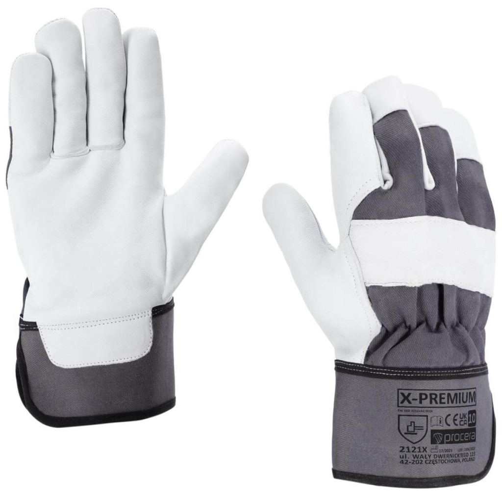 Az X-PREMIUM kesztyűk markolatrészében egy darab kiváló minőségű, csúcsminőségű kecskebőrből készülnek, a kézközépcsont külső részén bőrerősítéssel és az ujjbegyekkel. A felsőrész erős szürke farmerből készült. Belülről bélelt. Merevített mandzsettával befejezve. Nagyon jó tapadás. Magas kopásállóság. CE EN 388. Csomagolás: karton 12/120. Szín: szürke/fehér.