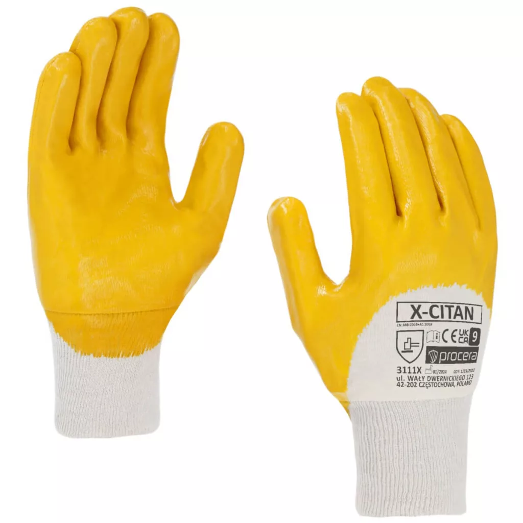 X-CITAN védőkesztyű kötött pamutszövetből, sárga nitrillel bevonva a tenyérnél és a felső rész felében, kötött mandzsettával. A nitril bevonat növeli a kesztyű olajokkal, zsírokkal, folyadékokkal és szennyeződésekkel szembeni ellenállását. Gépészeti, szállítási, karbantartási és javítási, építőipari és egyéb munkákhoz tervezték.