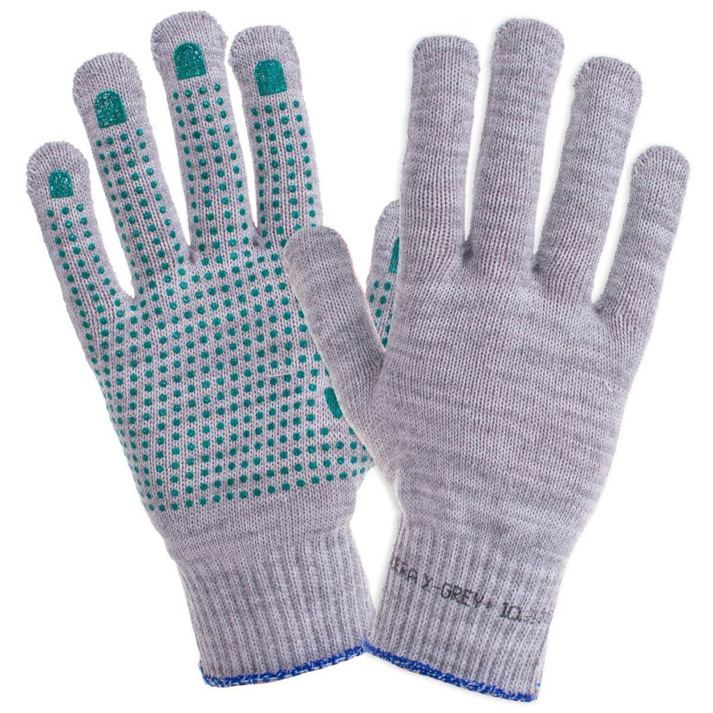X-GREY kesztyű 70% pamutból és 30% kiváló minőségű poliészterből, további PVC pontokkal a fogás javítása érdekében. Nagyon jó érzés a tartott tárgyról. Jól illeszkednek a kéz formájához. Rugalmas. Zsinórral befejezve. CE. Csomagolás: karton 12/300. Fehér szín. Elérhető: 7, 8, 9, 10 méretben.